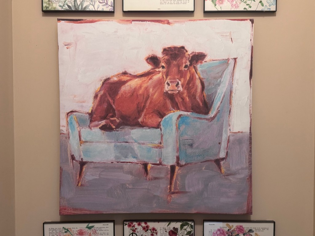 Meanwhile in my master bathroom a drawing from one of these past relationships hung on the wall, repeatedly taunting me with its unwelcome presence. Prior to the confusing upheaval in my life, the drawing had daily brought me joy. Now it incessantly poked at my festering wound. I wanted to remove the drawing, but I knew that the replacement would have to be carefully chosen or it would only further aggravate. What could I possibly put in its place that would actually provide any measure of comfort? Then I happened upon the painting of the cow reclining on the chair. Perfect!